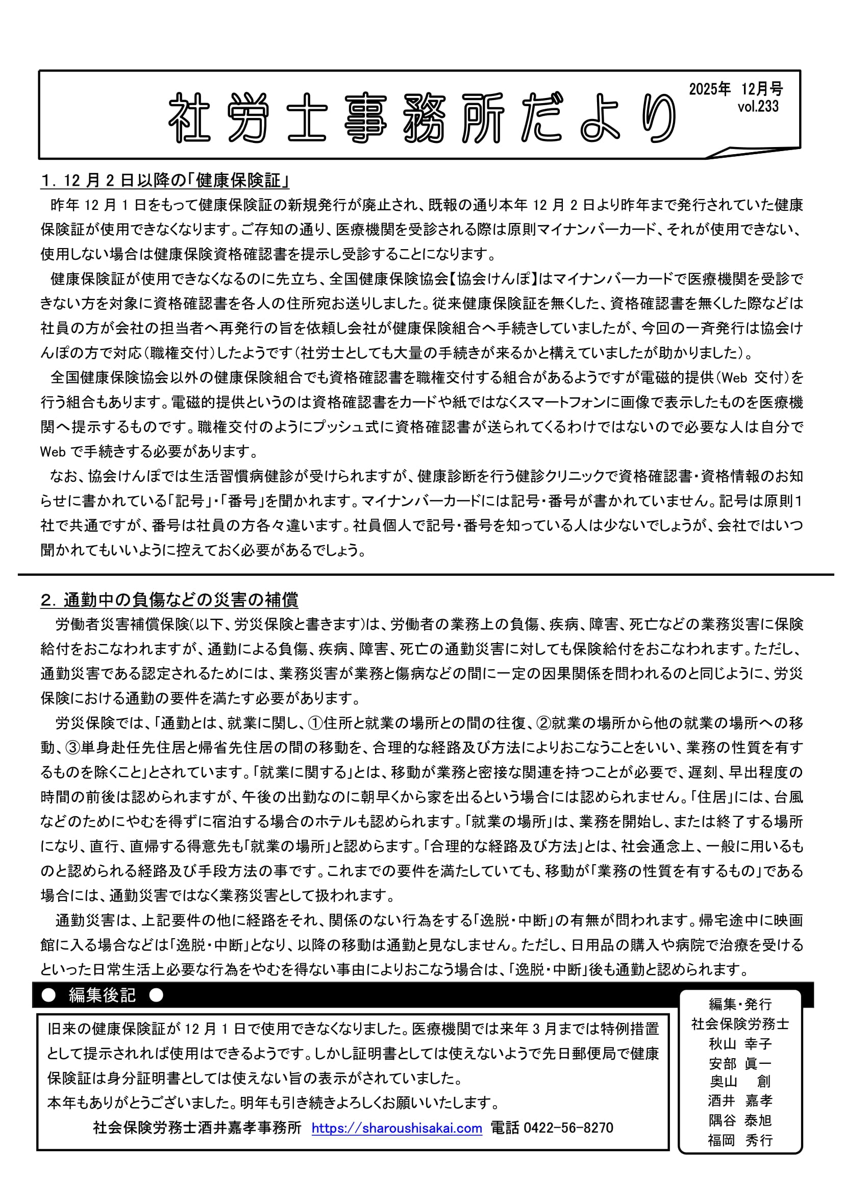 お知らせ 2512 2025年12月25日 FacebookXBlueskyHatenaCopy カテゴリー一覧 事務所だより お知らせ 最近の投稿 事務所だより1月号 事務所だより12月号 事務所だより11月号 事務所だより10月号 当事務所におけるカスタマーハラスメントに対する基本方針の公表について まずはお気軽にお問い合わせください! 受付時間:平日9時から17時30分 定休日:土日祝