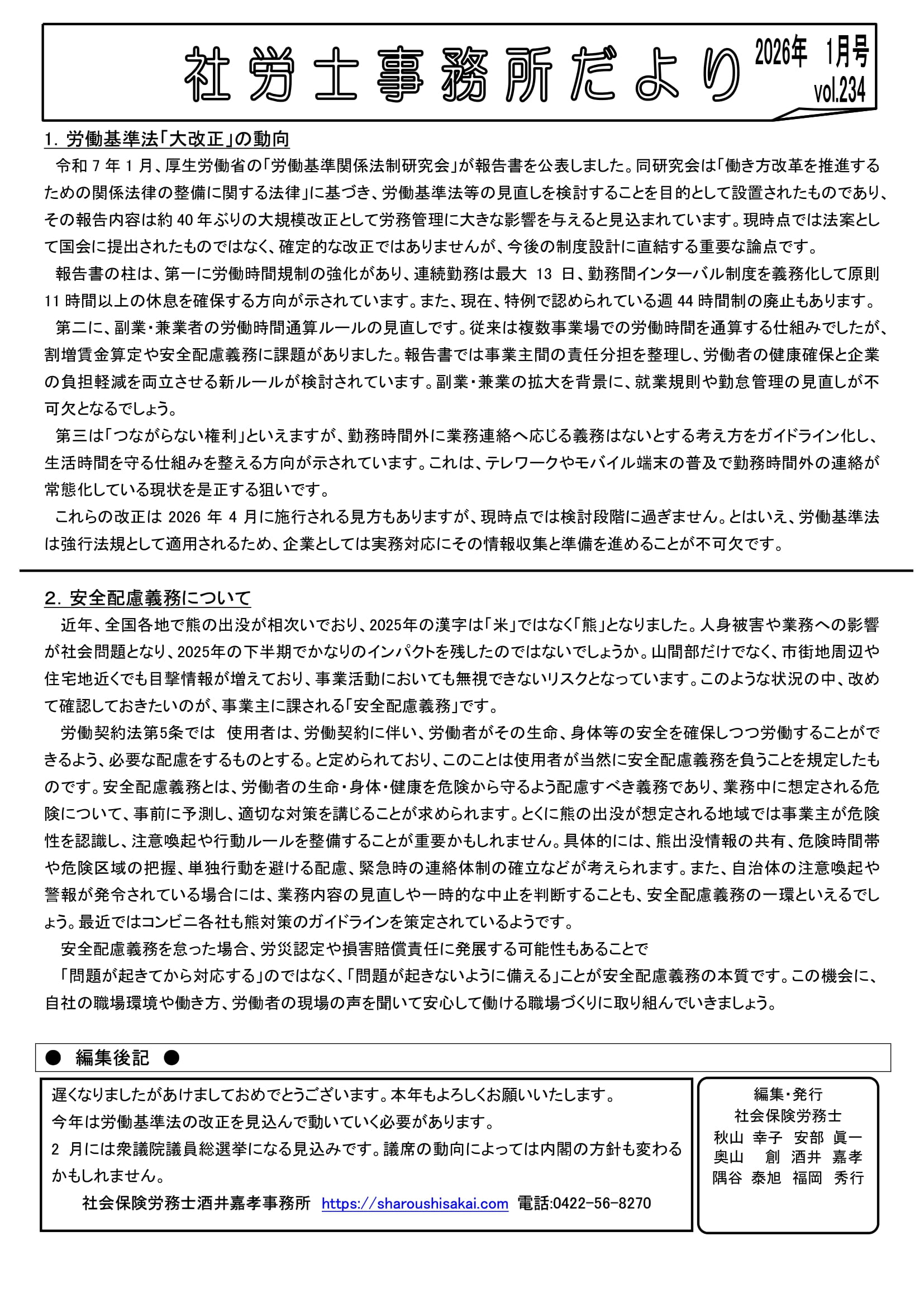 お知らせ 2601 2026年01月16日 FacebookXBlueskyHatenaCopy カテゴリー一覧 事務所だより お知らせ 最近の投稿 事務所だより2月号 事務所だより1月号 事務所だより12月号 事務所だより11月号 事務所だより10月号 まずはお気軽にお問い合わせください! 受付時間:平日9時から17時30分 定休日:土日祝